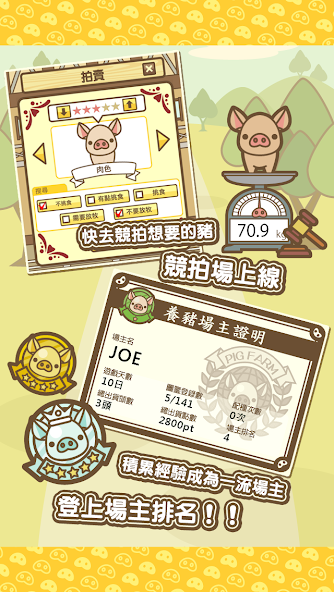 Pig farm MIX Mod is a livestock breeding simulation where players manage a virtual pig farm. The core loop involves purchasing pigs, feeding them, crossbreeding them to create new species, and selling the offspring at auction to generate in-game currency. The app targets casual simulation players with an interest in animal husbandry mechanics. Its educational framing focuses on breed variety rather than deep economic management.