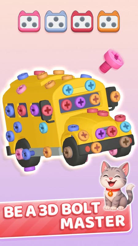 3D Bolt Master MOD APK (Menu/Free In-App Purchase) gives you the opportunity to challenge your brain through the challenge of disassembling objects. A new scene will appear before you and surprise the player with colorful objects. These items appear a lot in your life and they are made up of blocks of different colors. This great combination has created a lively atmosphere for each object, but you will be the one to disassemble them. Your task is to find all the removable screws and gradually explore the inside of the object. The details are attached together by screws that will give you a headache. Only players who are knowledgeable about the structure can decode, are you among them?