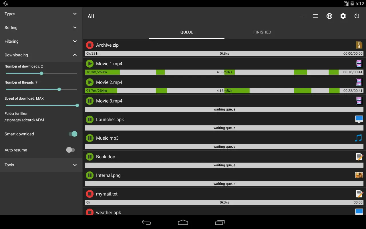 the application features a cool and customizable user interface with enticing themes, a variety of folders for storing downloaded files, automatic cessation of downloads when the charge level of the battery drops below a certain threshold, and the ability to store different files in different folders. The completion of the download of your file will trigger a series of steps to be carried out on their own, and if you want to speed up the process, you can make a new file that is empty. The downloading of your file will start up again immediately if it was halted for any reason, including an error or a disruption in your internet connection. In addition to this, it stores a list of all of the files that were imported in the form of a text file on a storage device card.