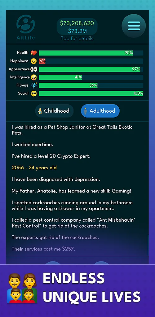 The primary mod feature activates automatically. Upon launching AltLife - Life Simulator Mod and beginning a new life or loading an existing one, the money stat will display a maximum value. No additional taps or menu navigation is required to enable the financial override.
