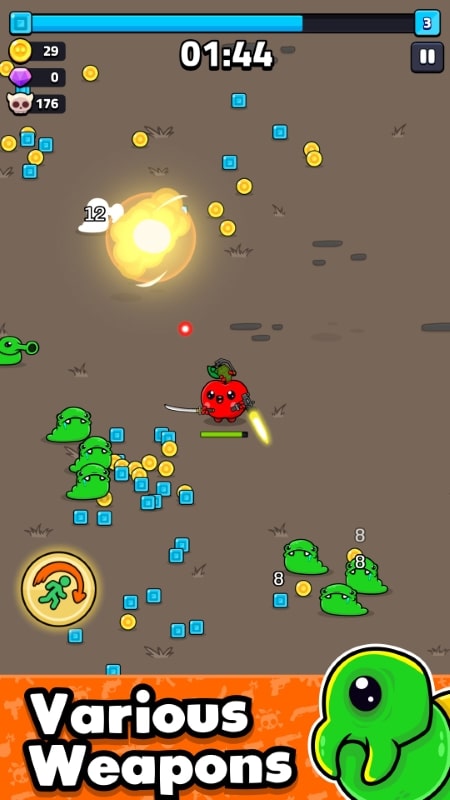 When fighting worms, you are not only equipped with powerful weapons from before but can also develop right in the match. Apple Grapple APK 1195 allows you to increase your combat power when reaching the required level. Each level milestone achieved will give you three options for combat skills. Including Attack Range, Movement Speed ​​and Max HP will be great conditions for you to quickly achieve maximum power. Attack Range will make your shots more accurate, easily destroying targets with a single shot. To achieve faster movement speed, you need to choose Movement Speed. The amount of blood will reach maximum immediately when the player chooses Max HP. Download Apple Grapple MOD APK using effective combat skills to rescue the apple from the invasion of evil worms.