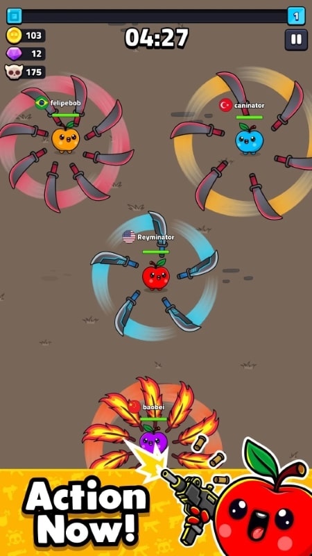 You are controlling a red apple against the attacks of brutal worms, it seems that the chance of victory is leaning towards the player. Apple Grapple APK mod allows you to control a red apple and the special thing is that it has two very useful hands. By using your fists to defend yourself, you can hit the worms and this attack also has the effect of repelling the enemy. But when the number of worms increases, it becomes weak and no longer effective. At this point, you have thought about replacing the normal attack by equipping a pistol. It proves to be very effective when only one shot can defeat the enemy. In addition, with the swords that you encounter on the way, when colliding, you will immediately receive the effect of the sword flying around and destroying any worms that come close.