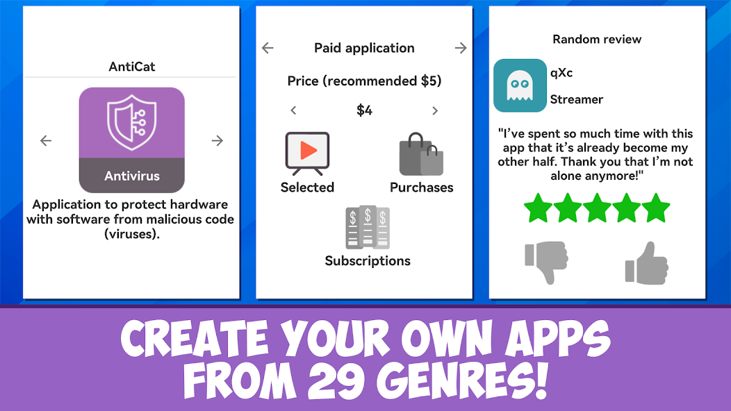 Dev Life Simulator Mod is a career simulation game focused on the process of video game development. Players manage a character's life, from creating a custom avatar to designing, coding, and marketing games within a fictional studio environment. The target audience is users interested in a light, stylized take on the software development cycle and life simulation mechanics.