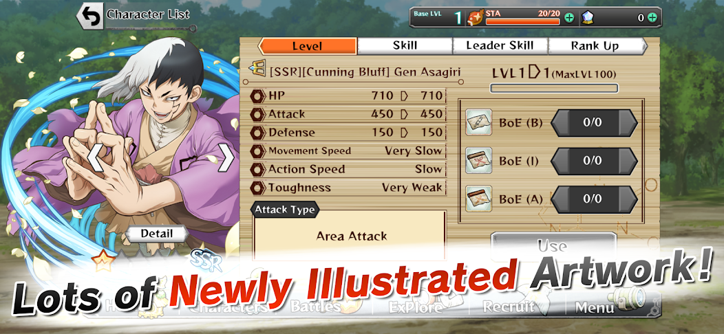 Dr Mod. Stone: Battle Craft is a strategy RPG based on the anime series, where players gather resources, research technologies, and craft items to build the Kingdom of Science and engage in touch-based battles against the Armed Empire. The game targets fans of the IP and players who enjoy resource management and incremental progression within a licensed narrative framework.
