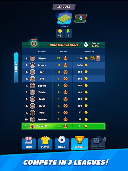 Collect and upgrade unique football player cards, then use your skills to achieve league promotion!
