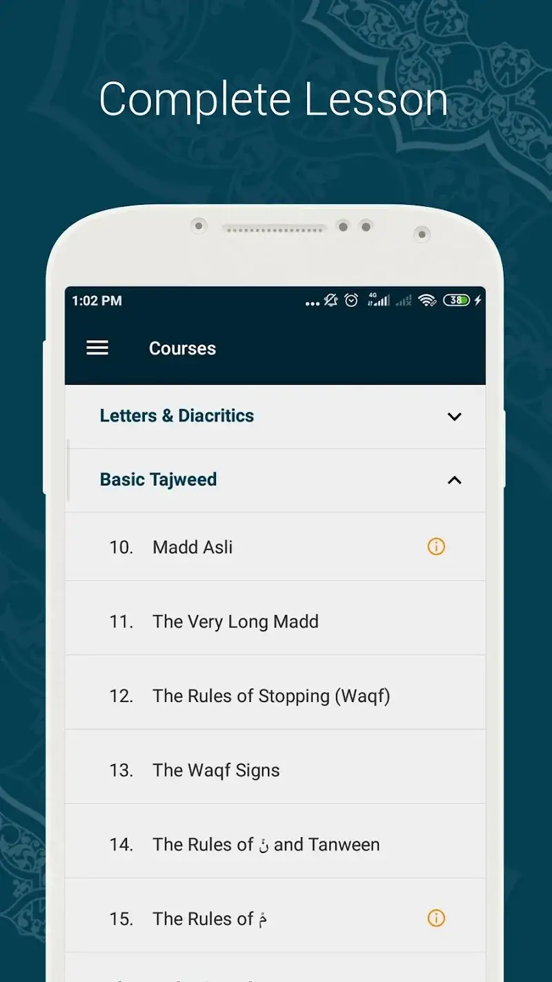 The mod is activated immediately upon launching Learn Quran Tajwid Mod. The premium badge or lock icons next to lessons are removed, granting full access from the first session.