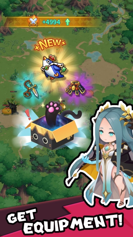 MeowZilla Mod es un juego de rol para Android con mecánicas de combate automático y apertura de cofres. El jugador gestiona la evolución de un gato héroe, recluta compañeros y mejora equipamiento para defender su aldea de monstruos. Está dirigido a usuarios que buscan un RPG de progresión incremental con estética anime.