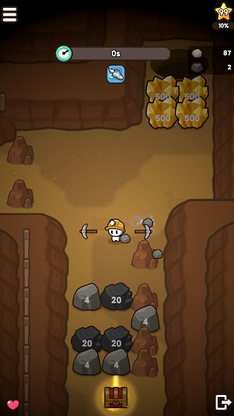 Deep underground, within the tunnels lies a wealth of rare minerals. To obtain them, you will need to overcome special challenges. Sometimes, players will encounter rocks and earth blocking their path. Behind them might be a massive gold nugget or a diamond mine waiting to be exploited. At this point, you will use the pickaxe you brought to dig these obstacles out of the way, opening a path to the gold and precious stones. Sometimes, Miner Go MOD APK will also provide players with mysterious treasure chests, hidden behind these obstacles to prevent exploitation.