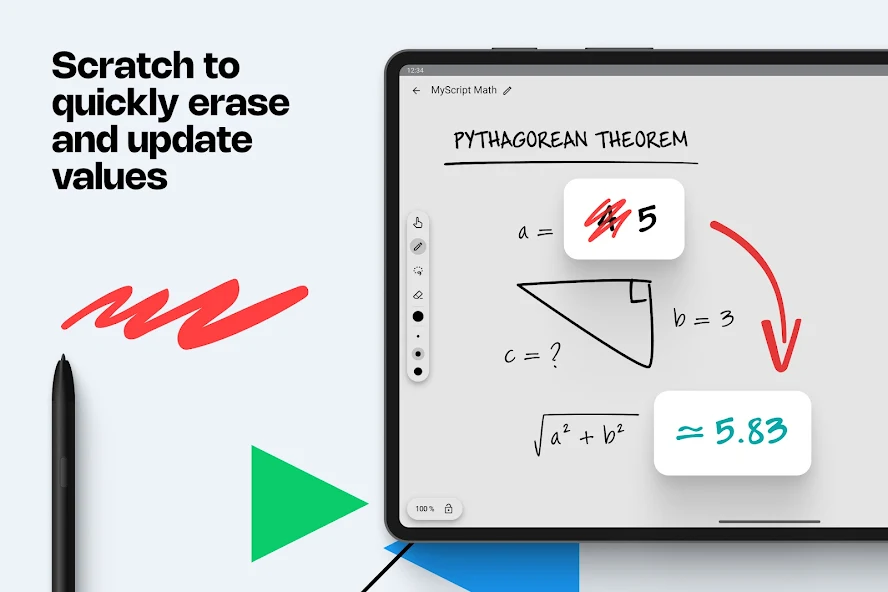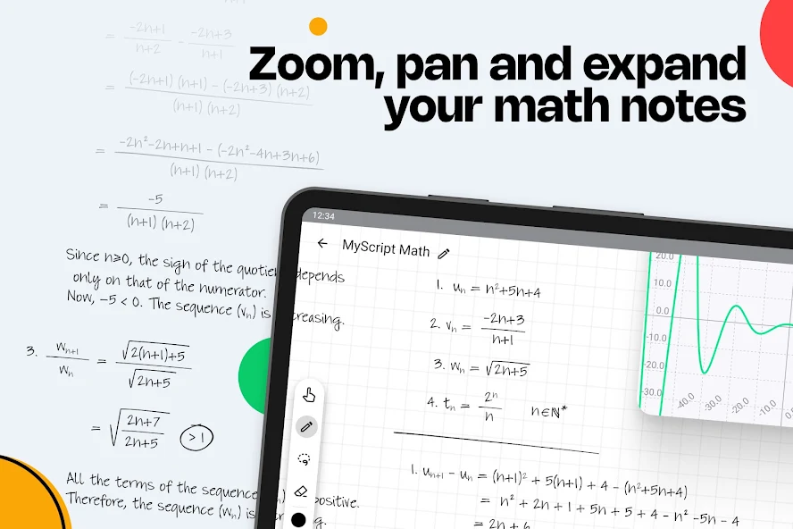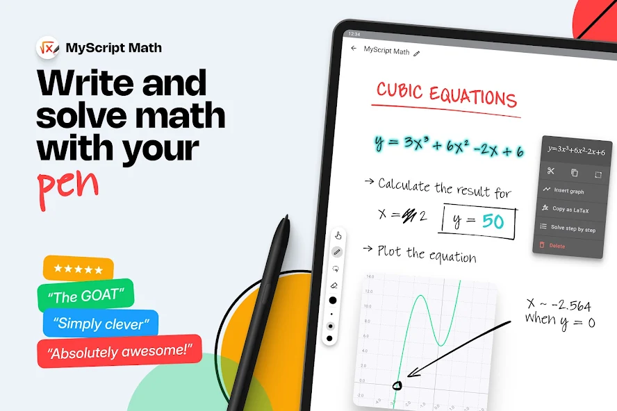 MyScript Math Mod is a specialized calculator application that converts handwritten mathematical notation into digital text, solves equations, and generates interactive graphs. It is designed for students, educators, and professionals who require a natural input method for complex mathematics without switching between keyboard and mouse. The app functions as a digital notebook for technical work, focusing on recognition accuracy and workflow efficiency over generic note-taking.