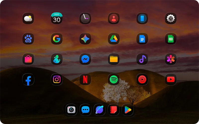 Casos límite conocidos: Algunos lanzadores muy personalizados pueden no ser compatibles con la aplicación de iconos global. Limpiar los datos de la aplicación OneColor GlassDark Icon Pack Mod no revierte los desbloqueos del mod. La función de solicitud de iconos depende de un servidor externo; su disponibilidad futura no está garantizada por el mod.