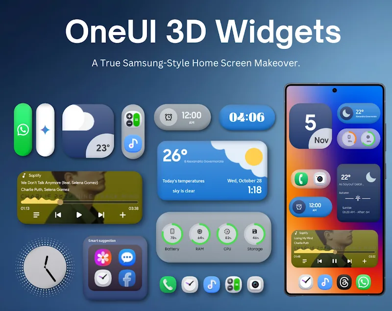 OneUI 3D Widgets Mod is a utility application designed for Samsung Galaxy devices running One UI. It creates animated, three-dimensional widgets for the home screen, offering visual enhancements like floating clocks, weather displays, and system monitors. The app targets users seeking to customize their device's aesthetic beyond the standard widget library. It operates as a standalone widget provider, requiring no system-level modifications.