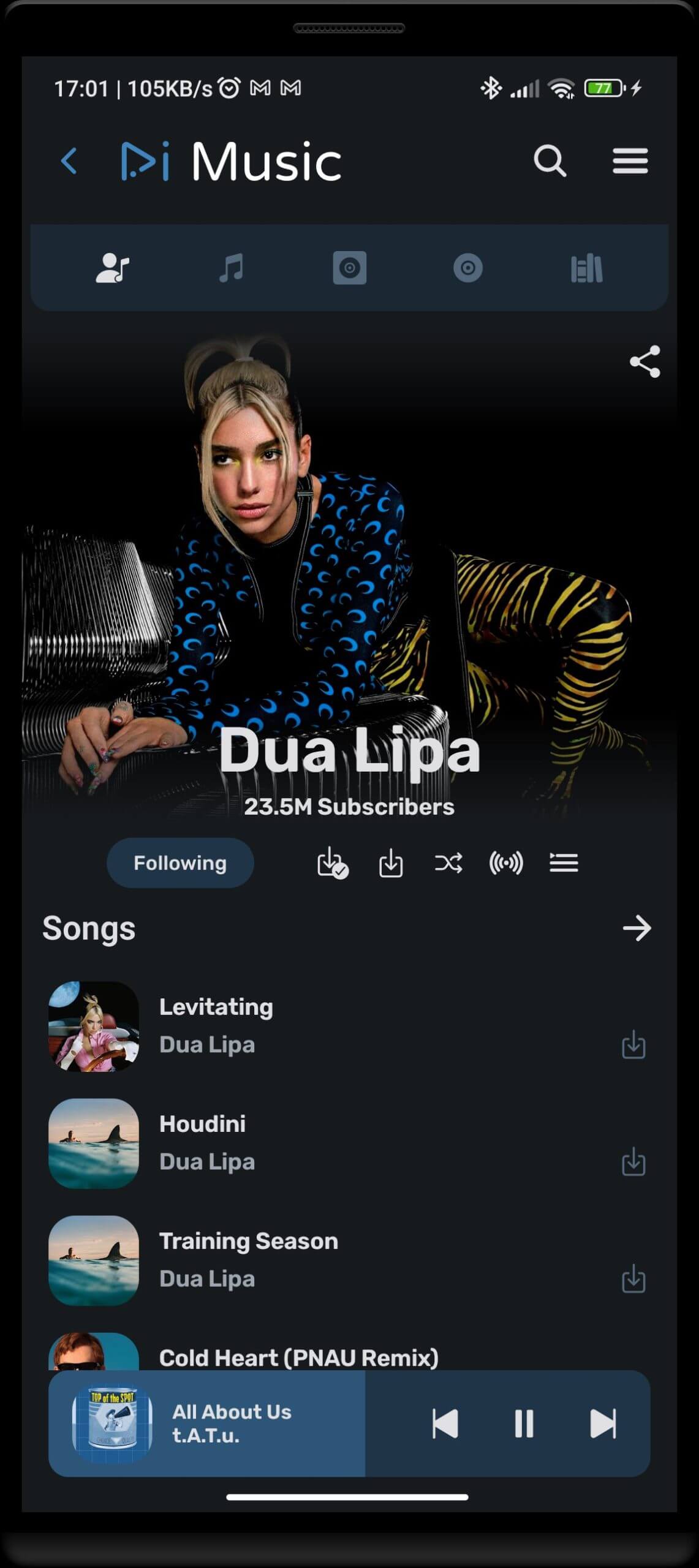 Para acceder a las descargas de audio, busca una canción o álbum dentro de RiMusic Mod. En la página de resultados o en la pantalla de reproducción, el botón de descarga estará disponible sin mostrar un límite de uso. La descarga procederá inmediatamente sin solicitar ninguna verificación de suscripción.