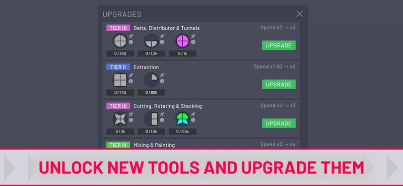 You are the one using the factory to create special and abstract shapes. You may feel this is an easy task to conquer in the initial levels. However, you need to own new, advanced equipment to get more complex images. So, you need to unlock those devices through stages and upgrade them. In addition, improving existing equipment will also help you optimize the production process. Thanks to that, you can test tools and create new types. Grow your production system the way you want with your equipment upgrades.