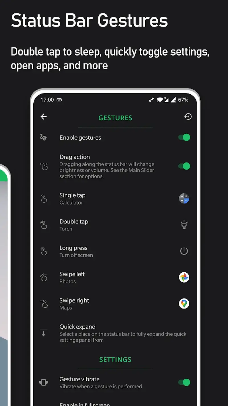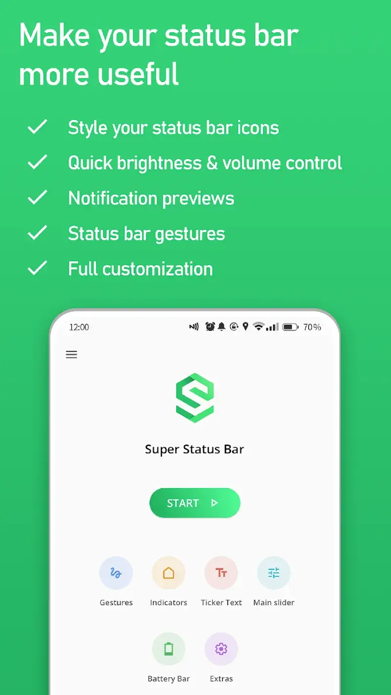 Super Status Bar Mod is a system utility that replaces the standard Android status bar with a fully customizable version. It adds gesture controls, notification ticker text, and direct brightness/volume sliders. The app targets users who want granular control over their device's top bar without requiring root access.