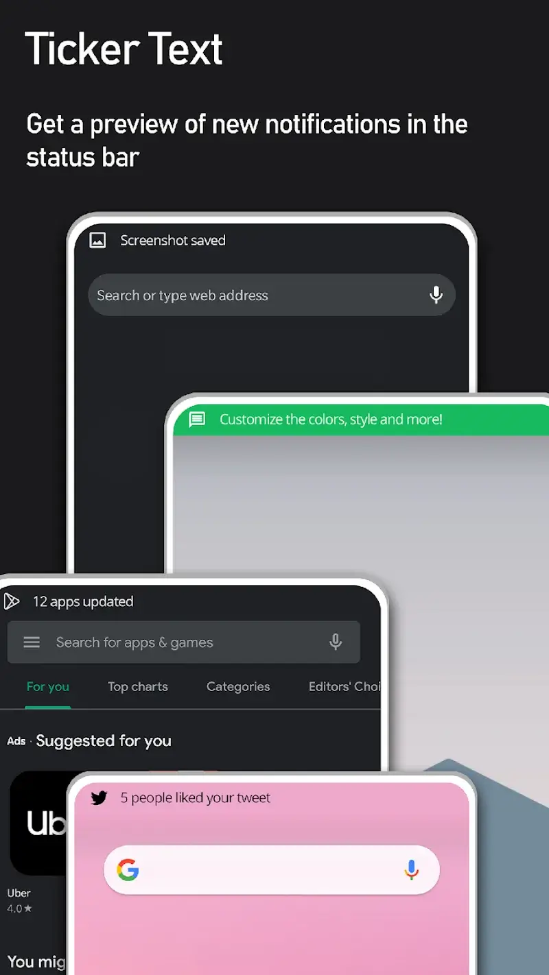 - The notification ticker text feature may conflict with system-level notification settings on Android 10 and above.