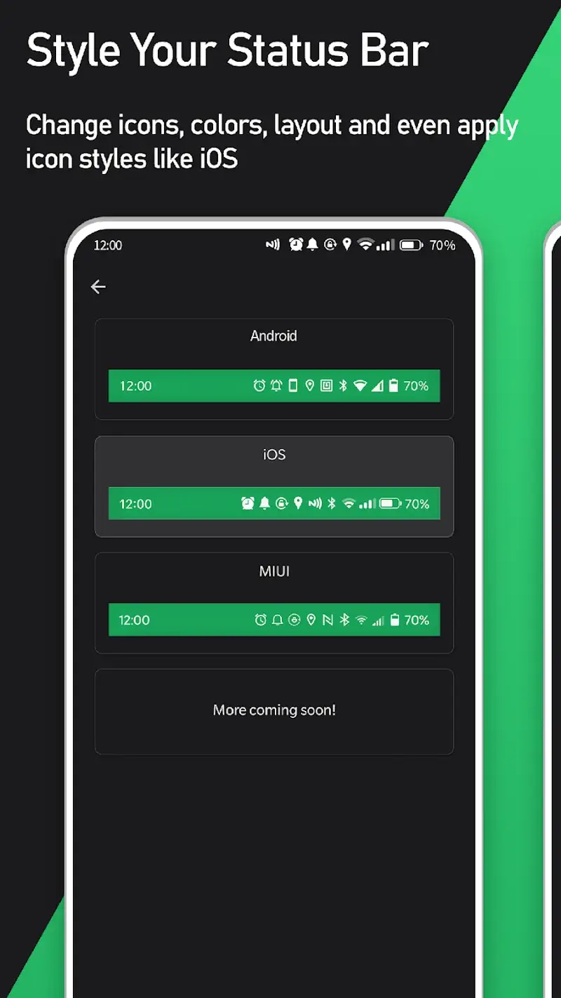 - All status bar style packs, including iOS 14, MIUI 12, and Android R, are available without purchase.