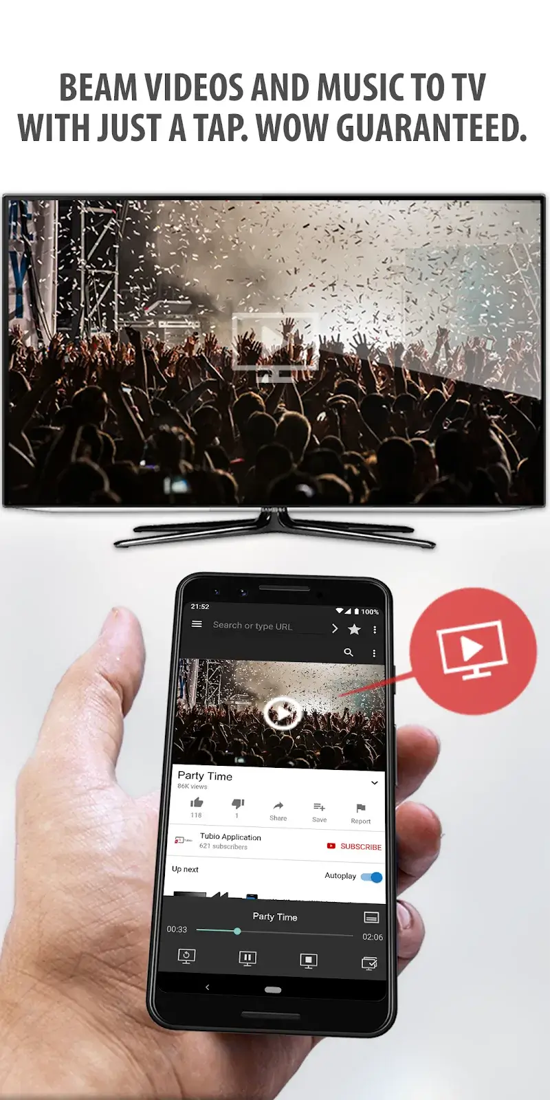 Tubio Mod is a casting application for Android that streams video and audio content from the web or local storage to compatible television sets and media players. It functions as a discovery browser and remote control, targeting users who want to watch web-based media on larger screens without dedicated apps. The app operates within the video and music utility category, focusing on DLNA/UPnP, AirPlay, and Chromecast protocols.